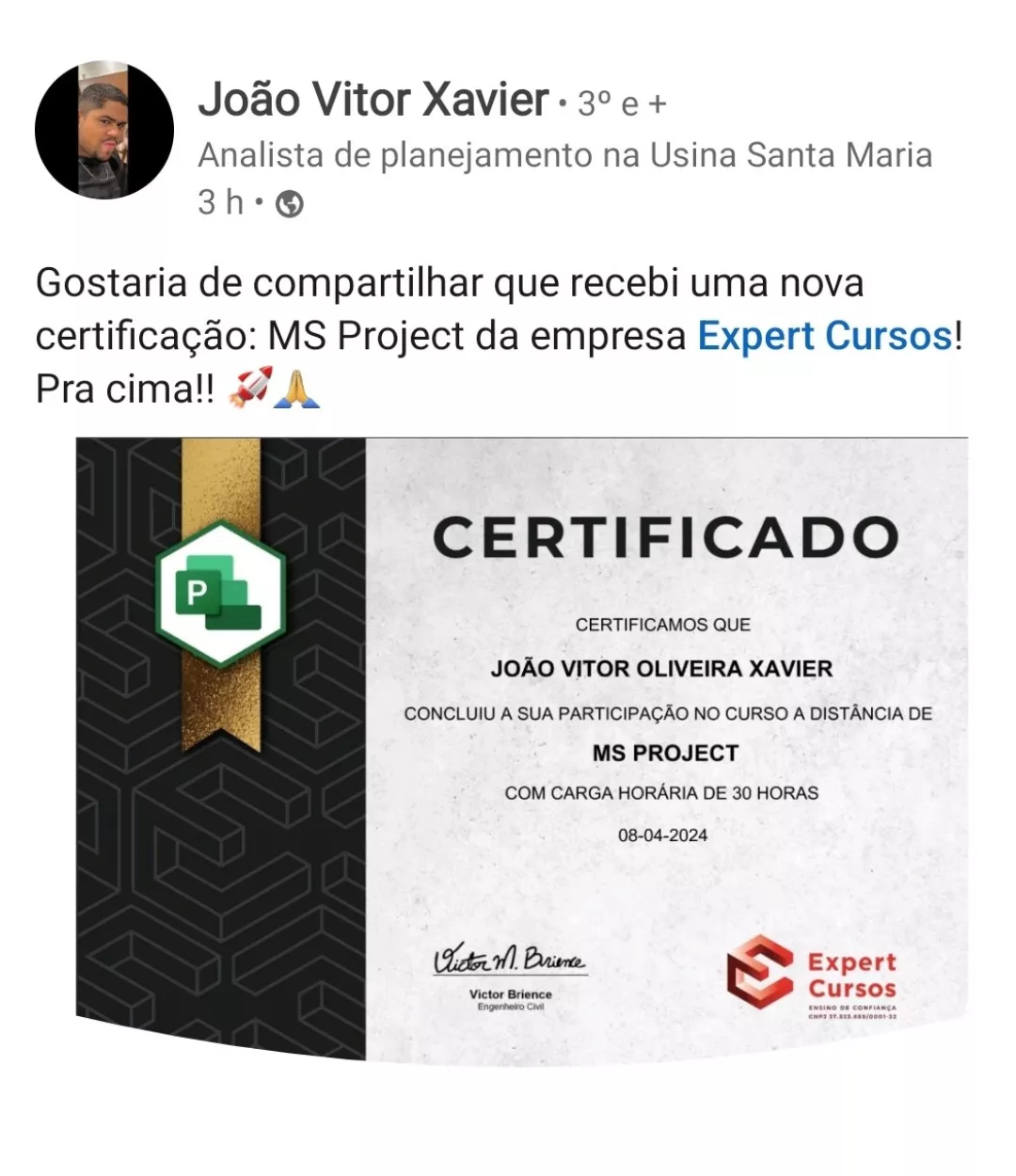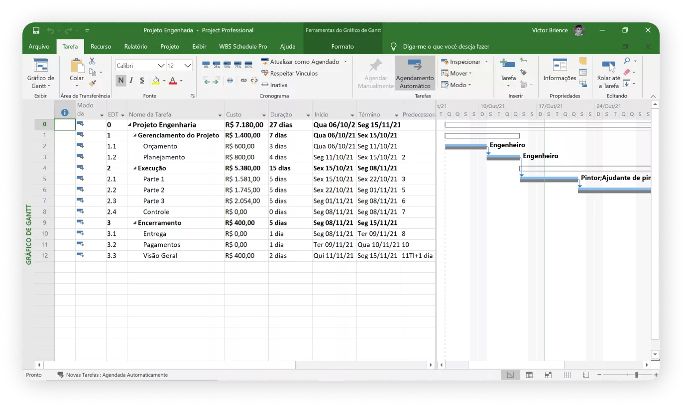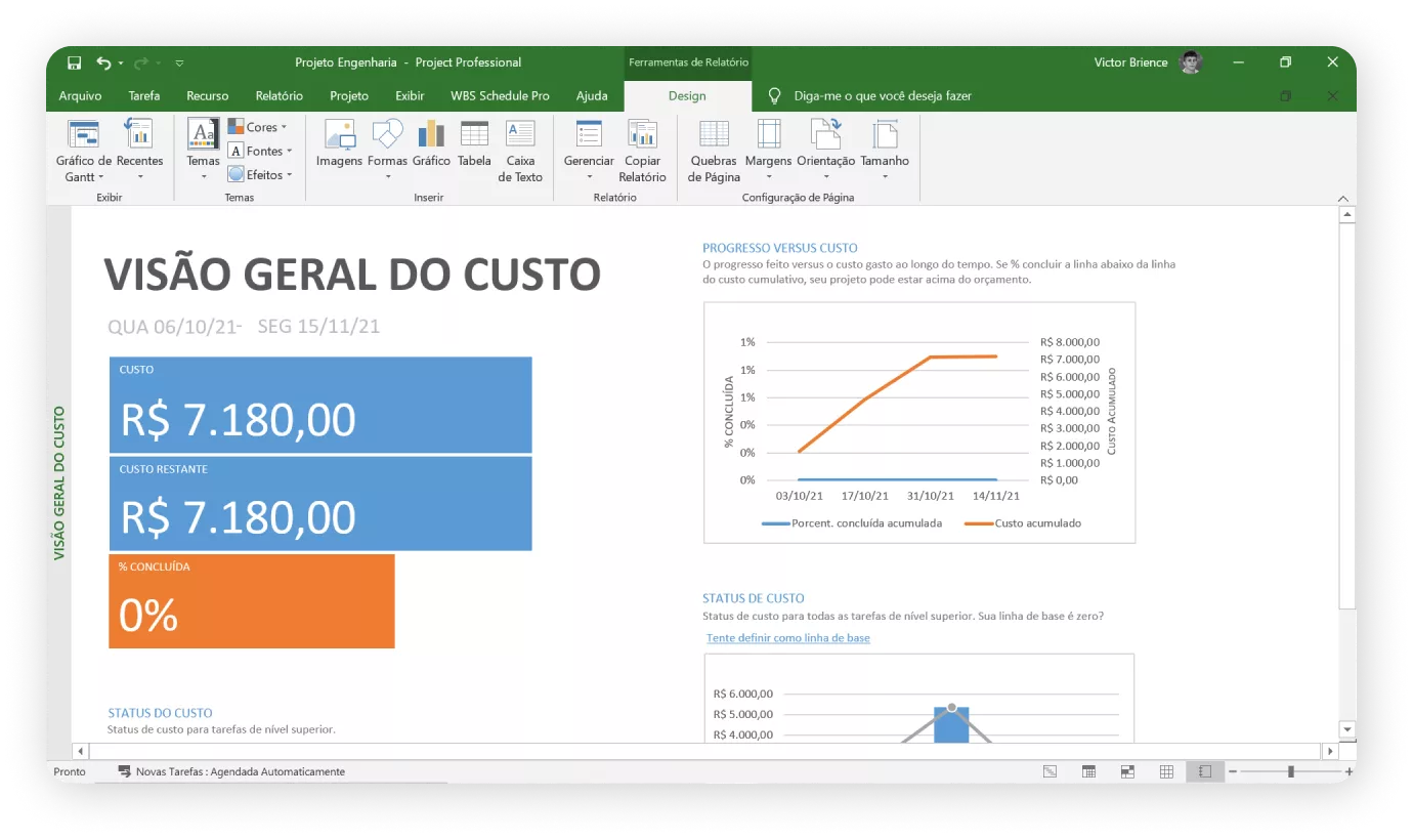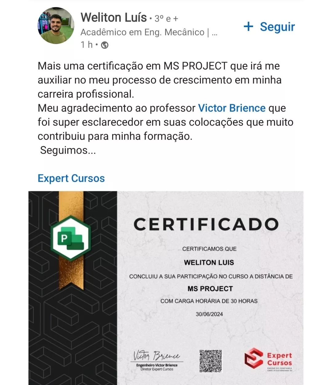 Victor, seu professor nesse curso, é engenheiro e especialista em MS Project e outros programas. Responsável por uma metodologia de aulas diretas, didáticas e com exercícios práticos para melhorar o aprendizado.
