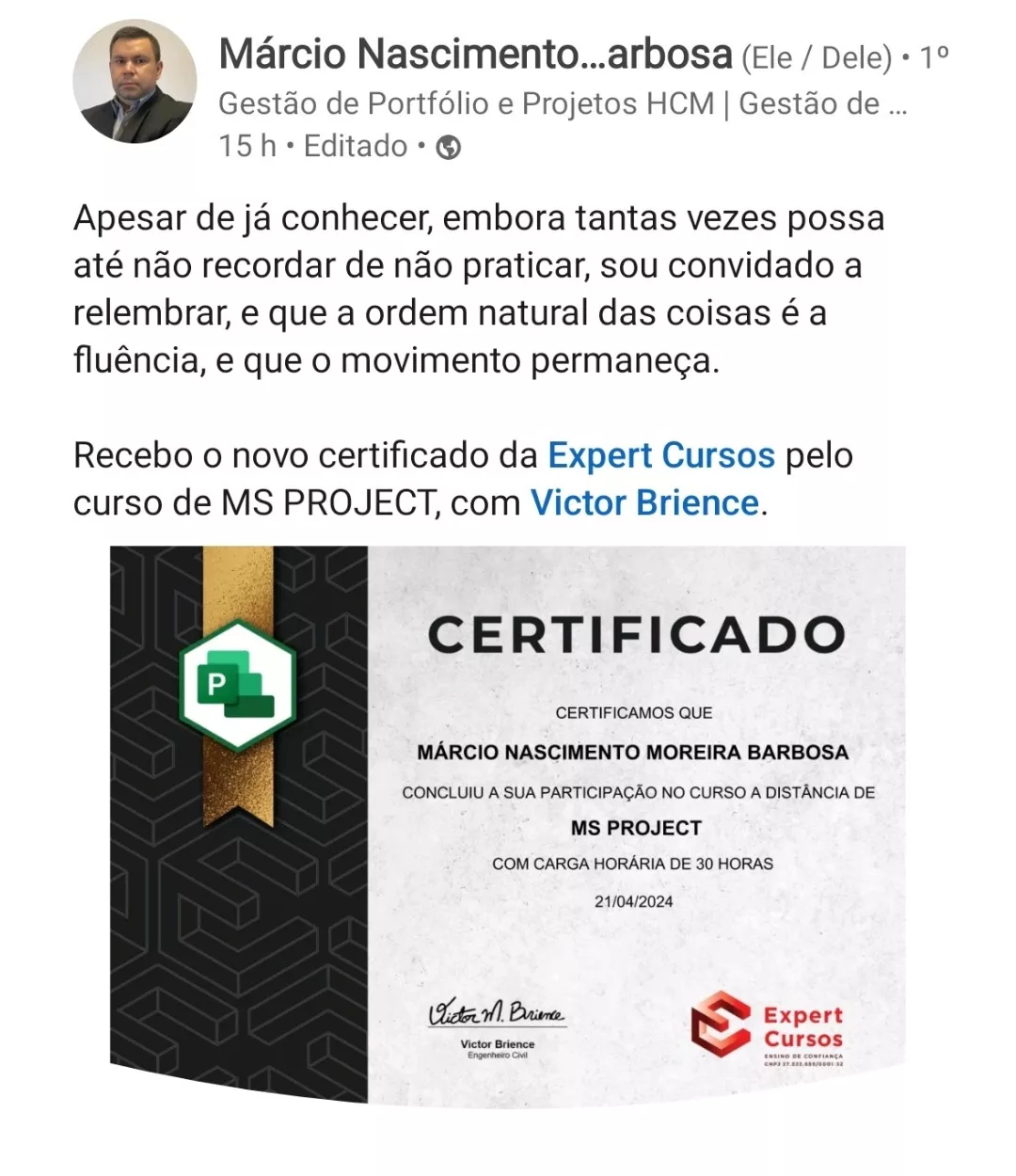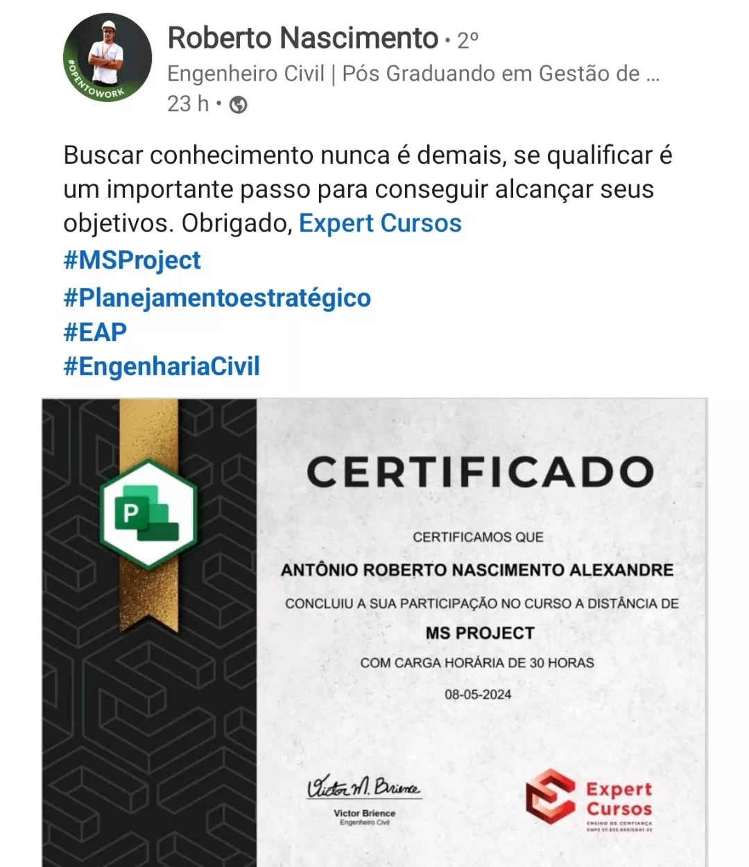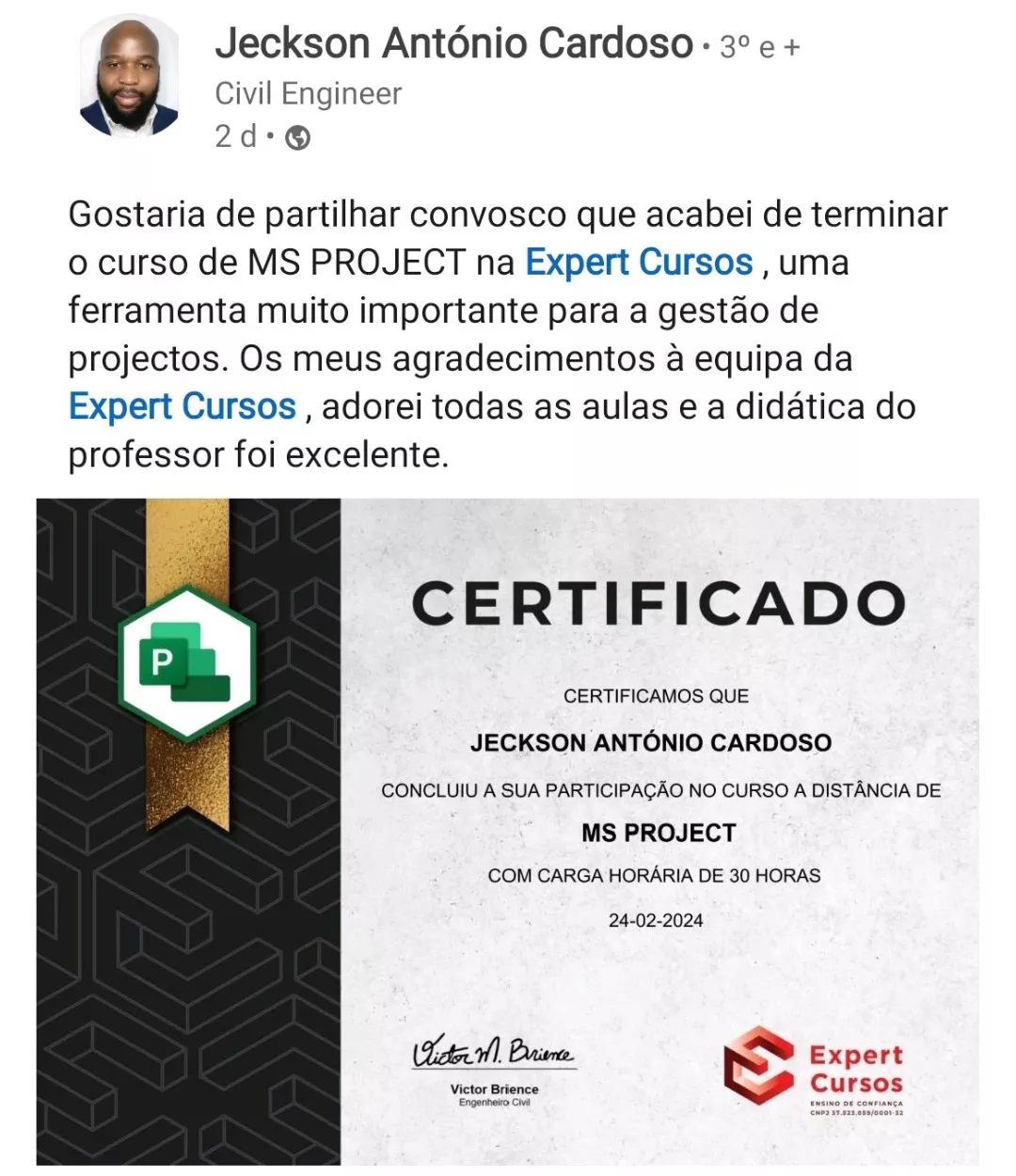 Victor, seu professor nesse curso, é engenheiro e especialista em MS Project e outros programas. Responsável por uma metodologia de aulas diretas, didáticas e com exercícios práticos para melhorar o aprendizado.
