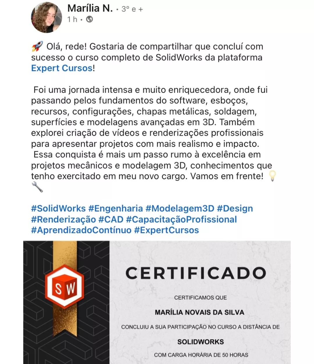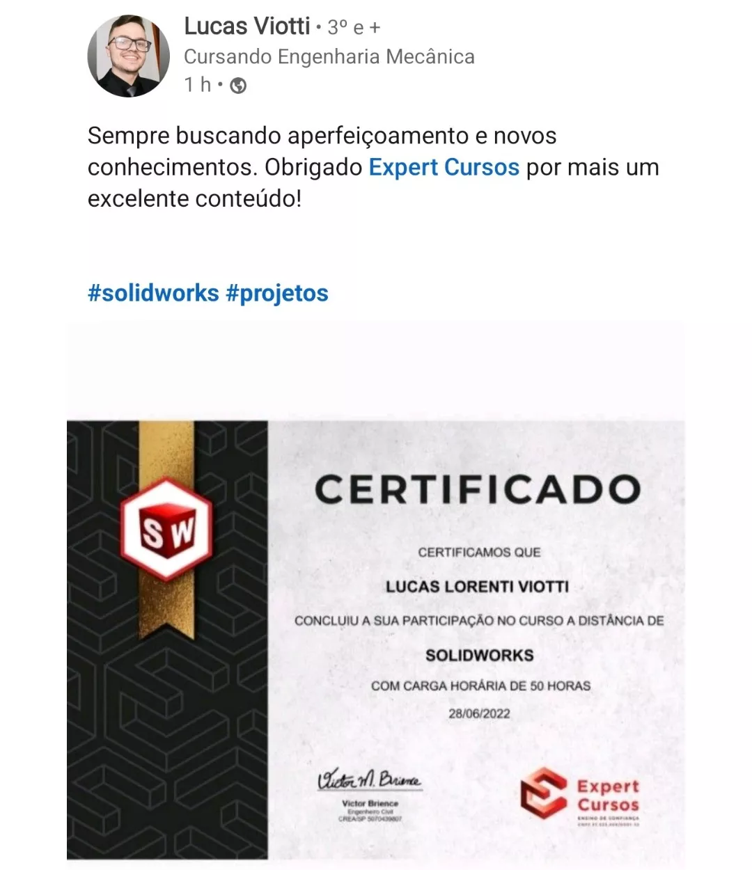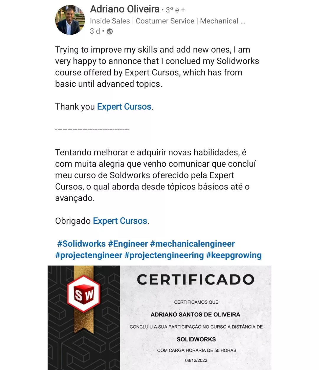 "Passando aqui para dar um feedback positivo e bem positivo do Curso de SolidWorks, para quem está afim de aprender vale a pena, eu já utilizava a ferramenta mas de maneira amadora e através do curso consegui me profissionalizar".
