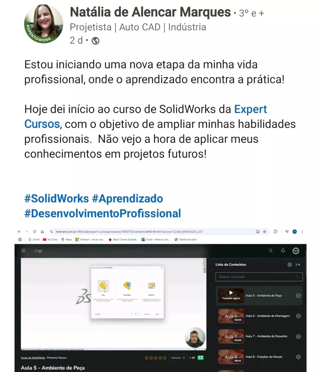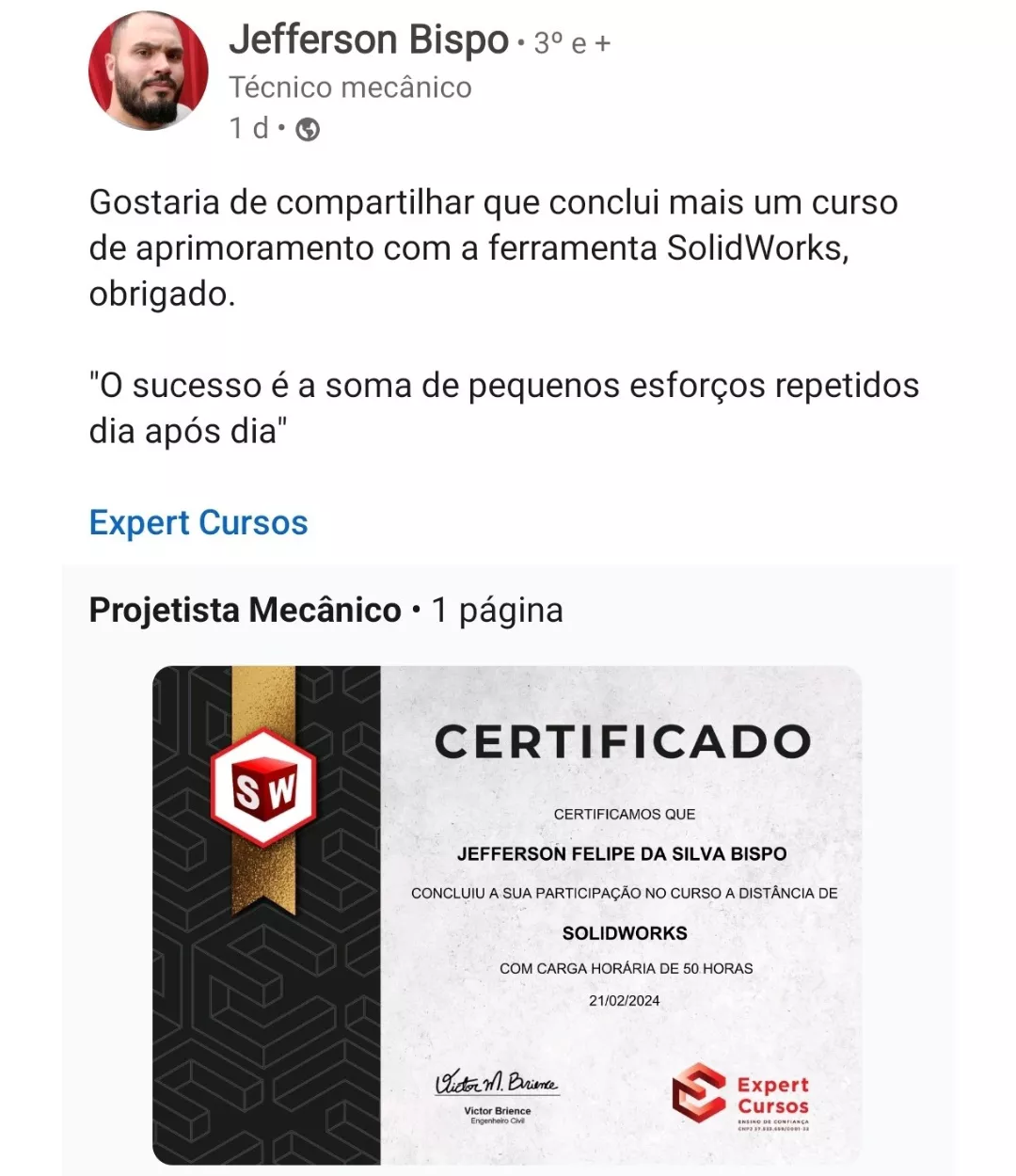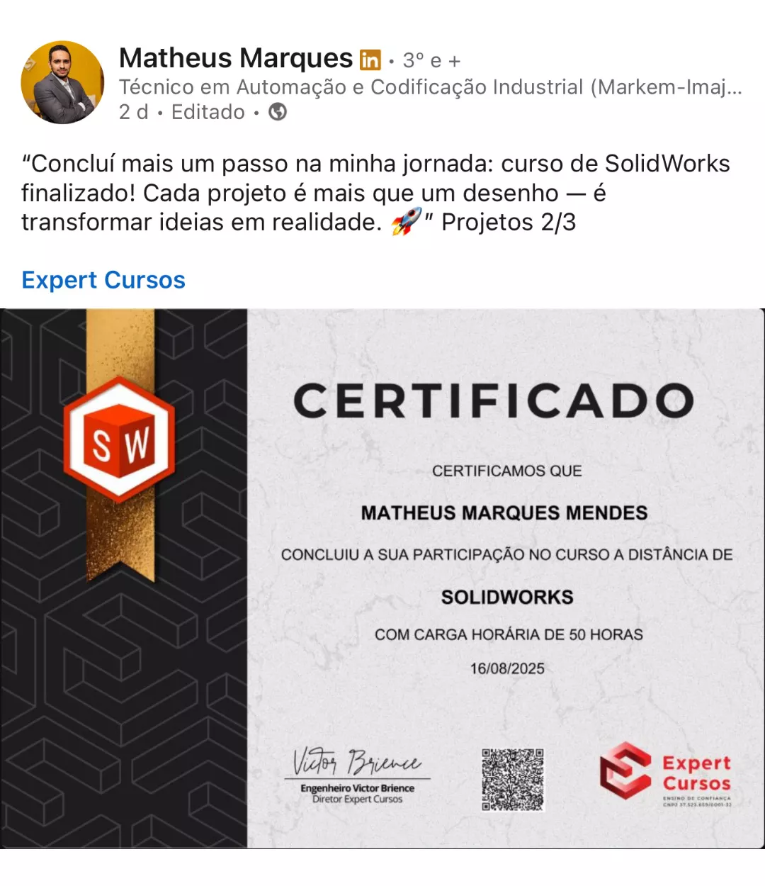 "Passando aqui para dar um feedback positivo e bem positivo do Curso de SolidWorks, para quem está afim de aprender vale a pena, eu já utilizava a ferramenta mas de maneira amadora e através do curso consegui me profissionalizar".