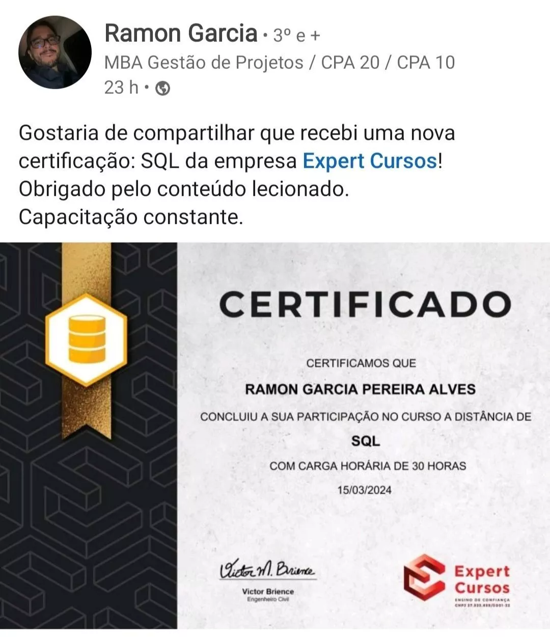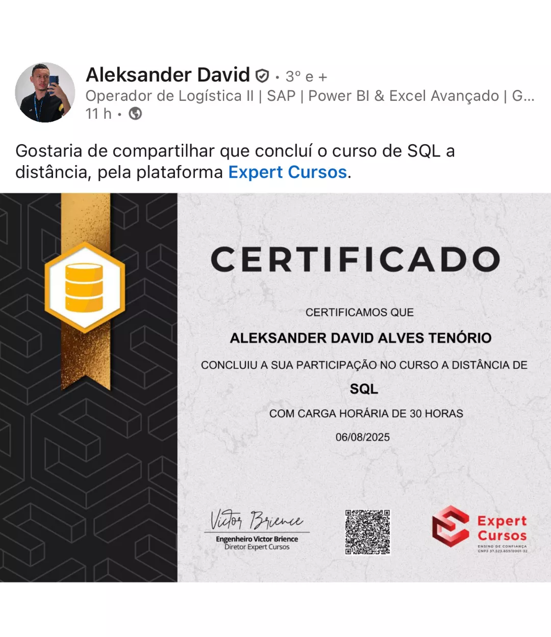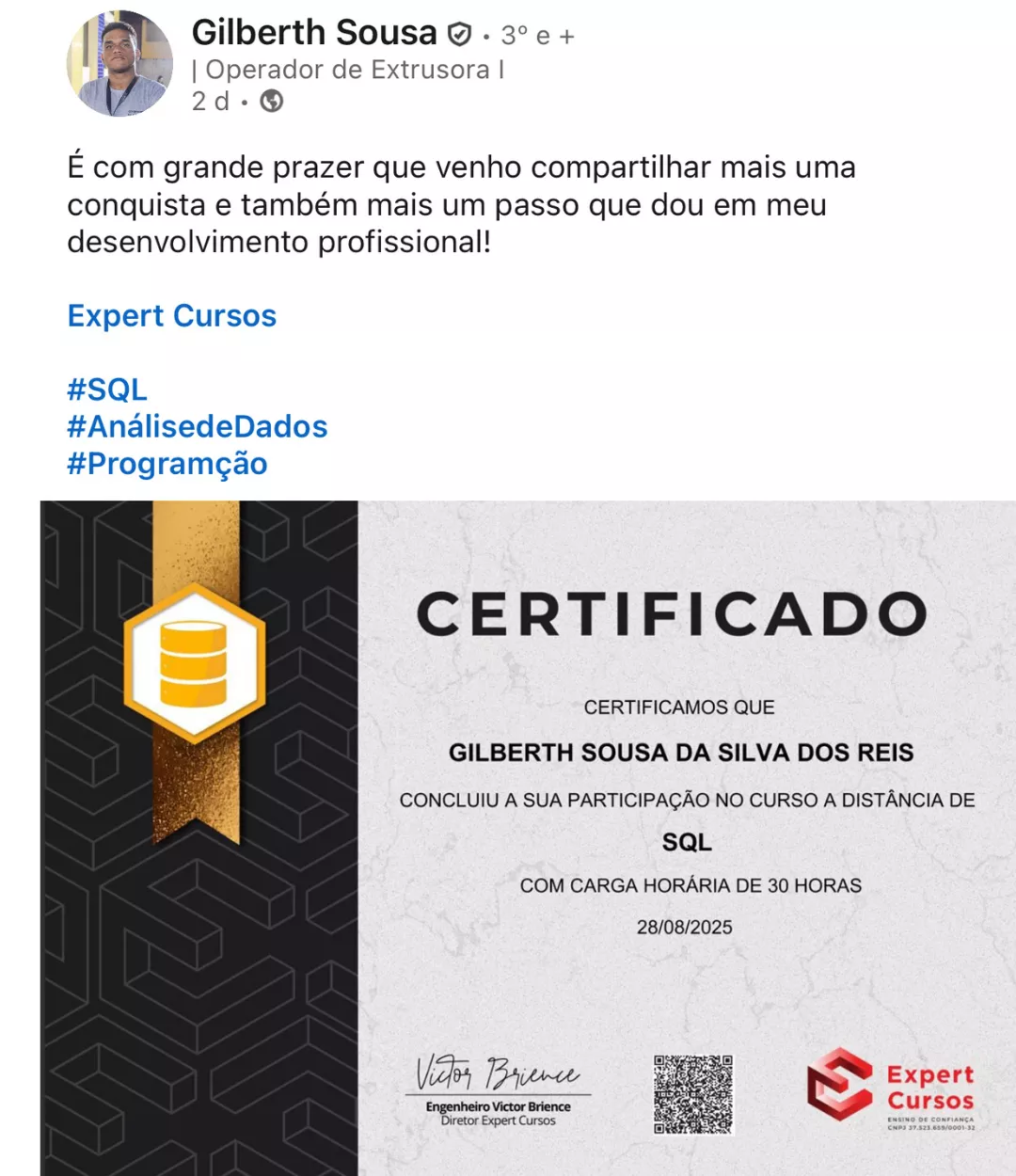 Você vai aprender tudo sobre SQL do Básico ao Avançado e com Certificado Reconhecido como capacitação profissional com carga horária de 30 horas, uma Área de Membros exclusiva onde você pode tirar todas as suas dúvidas com nossos professores.