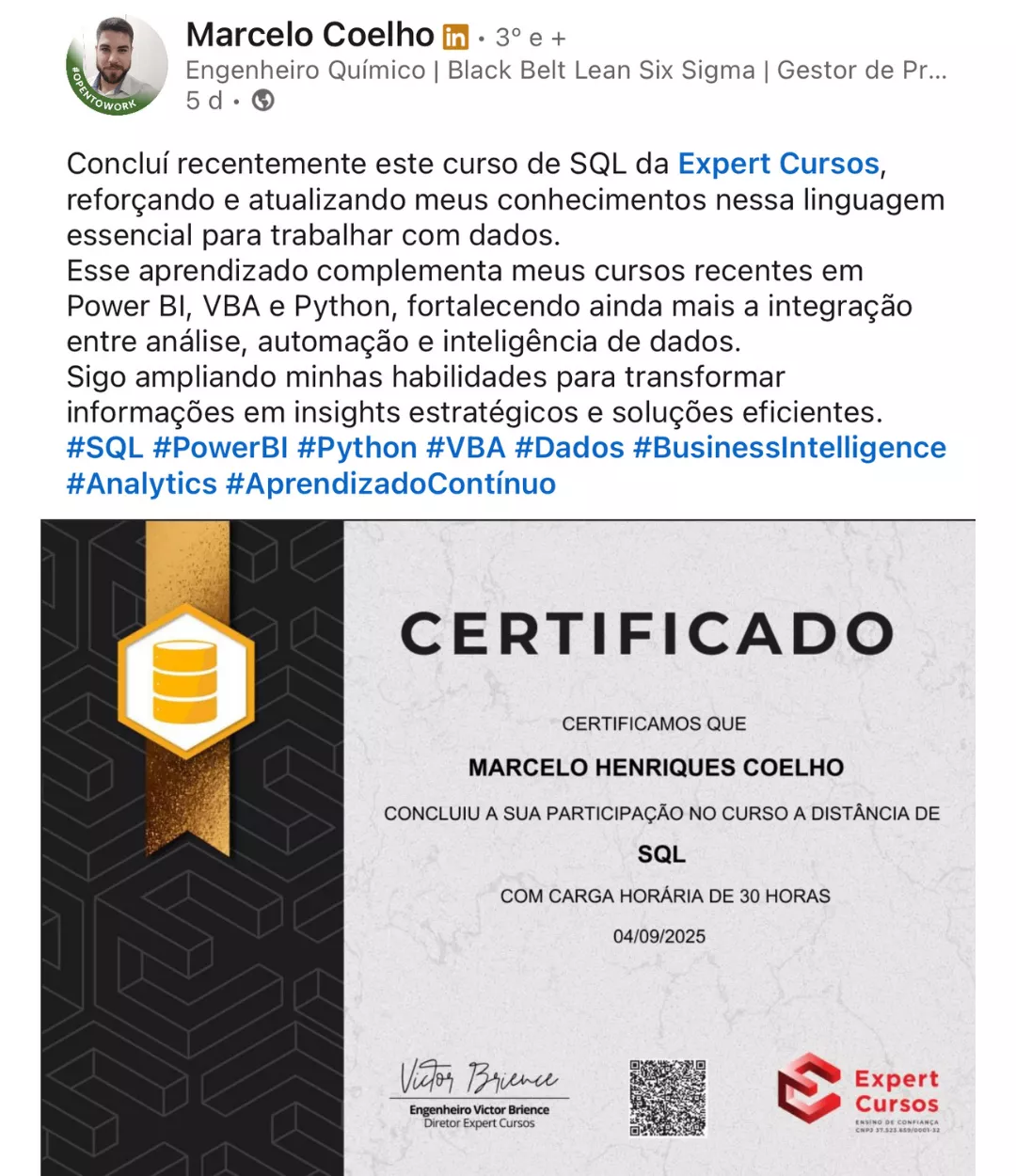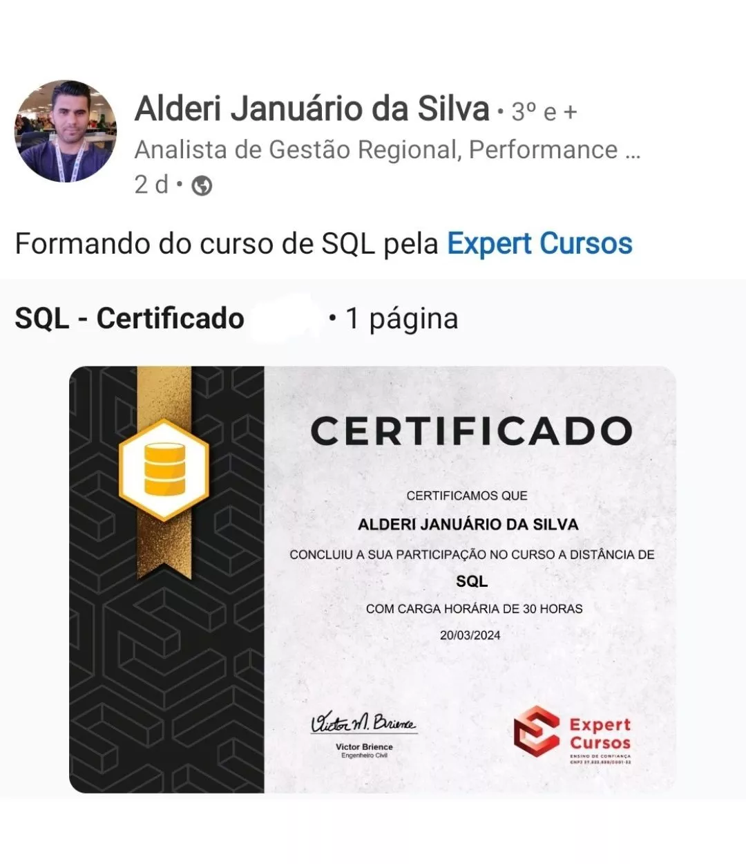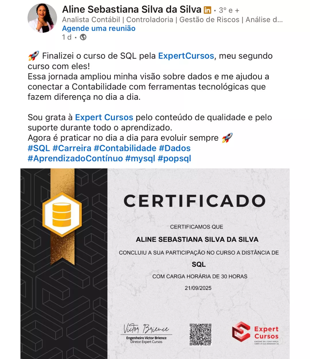 Você vai aprender tudo sobre SQL do Básico ao Avançado e com Certificado Reconhecido como capacitação profissional com carga horária de 30 horas, uma Área de Membros exclusiva onde você pode tirar todas as suas dúvidas com nossos professores.